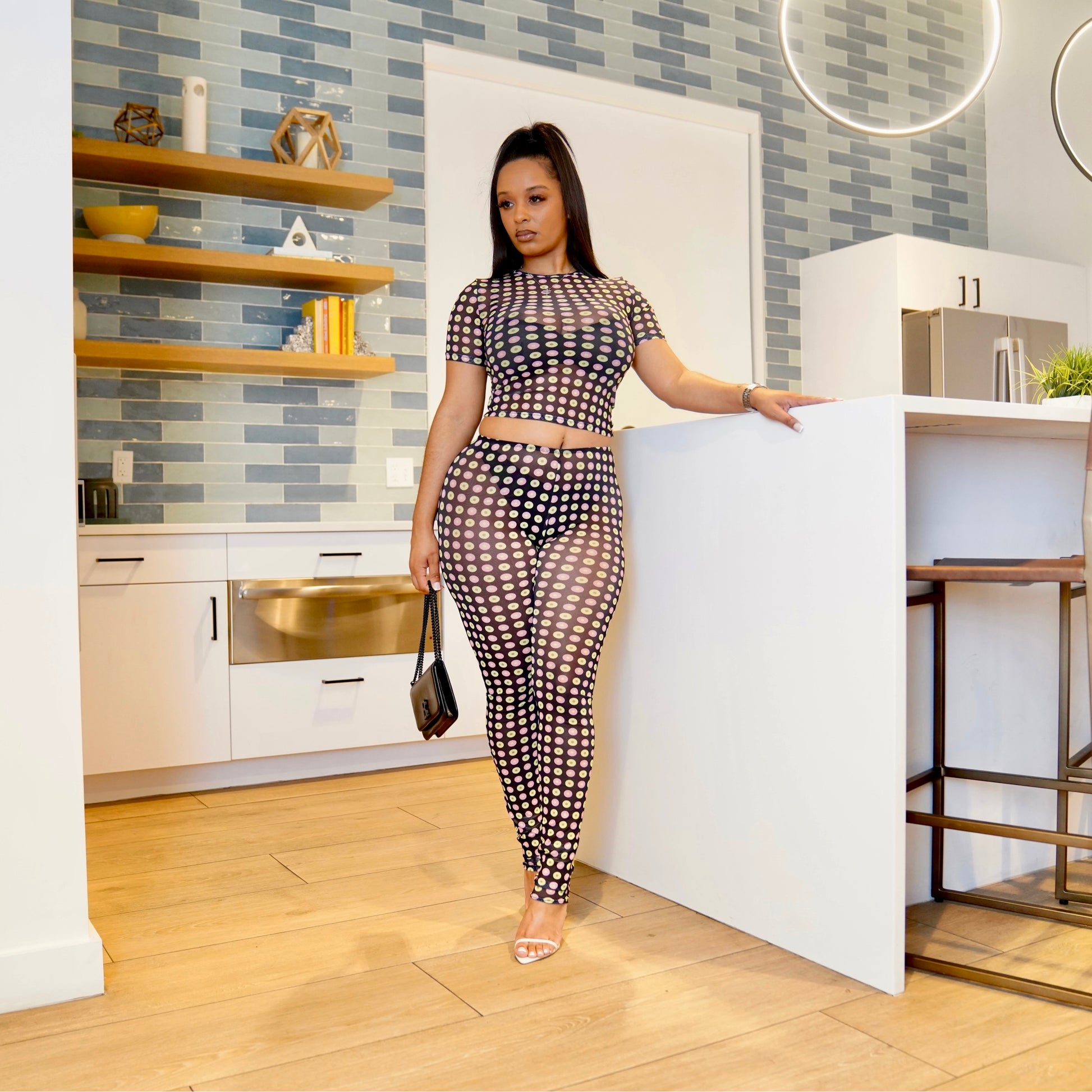 This mesh two-piece set features an adorned pink and green polka dots; The model stands at 5'2" and wears a size Medium.