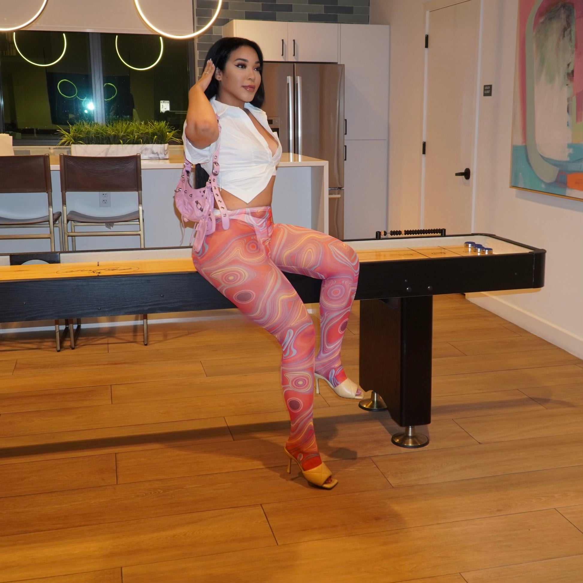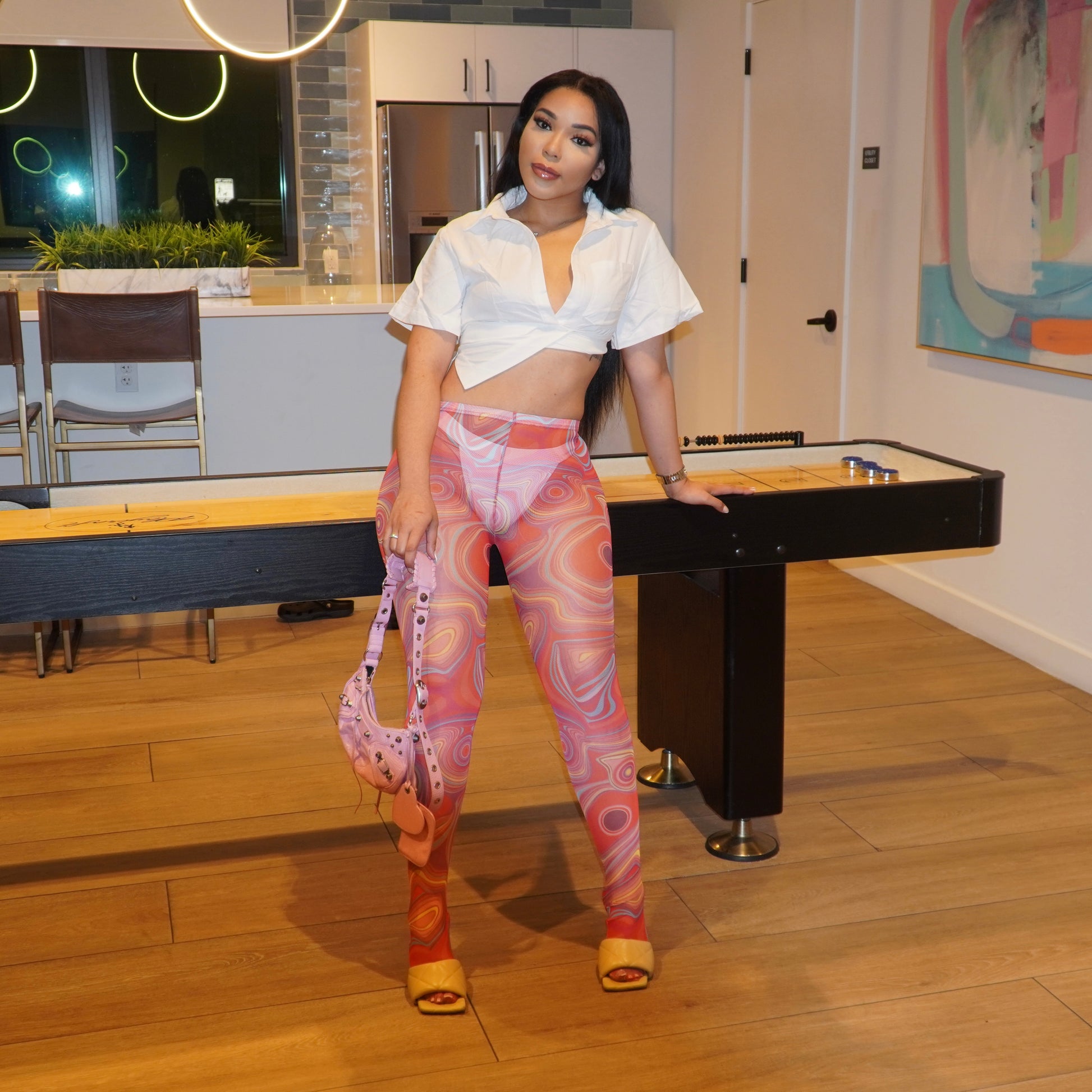 Crafted with a stylish swirl design, the Hypnotize Tights feature comfortable mesh footed construction. As seen paired with our 'London Top,' the model stands at 5ft 3" and wears size Medium.