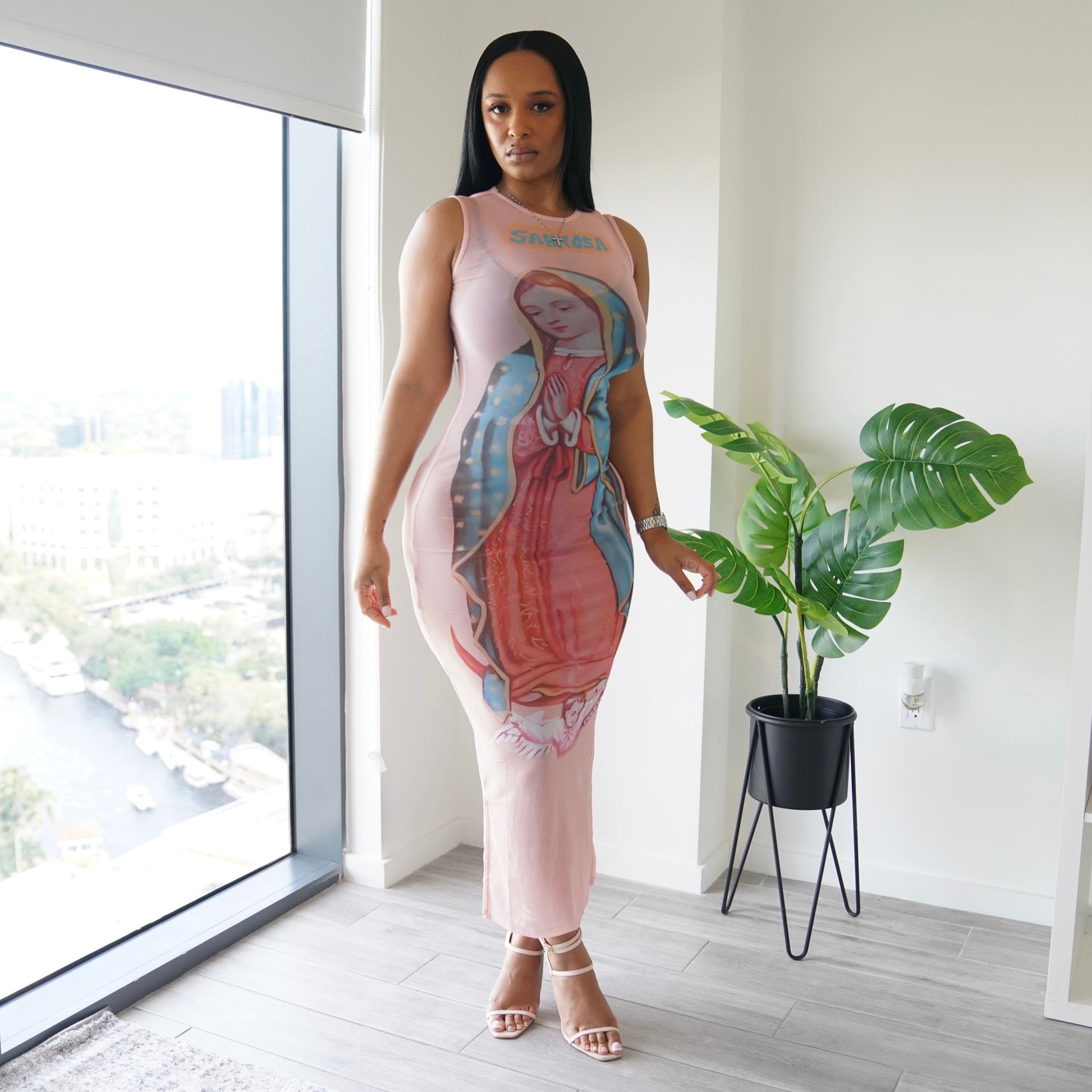 Featuring a mesh aesthetic print design, this dress has a stylish look. The model stands at 5'3" and wears a size Small.