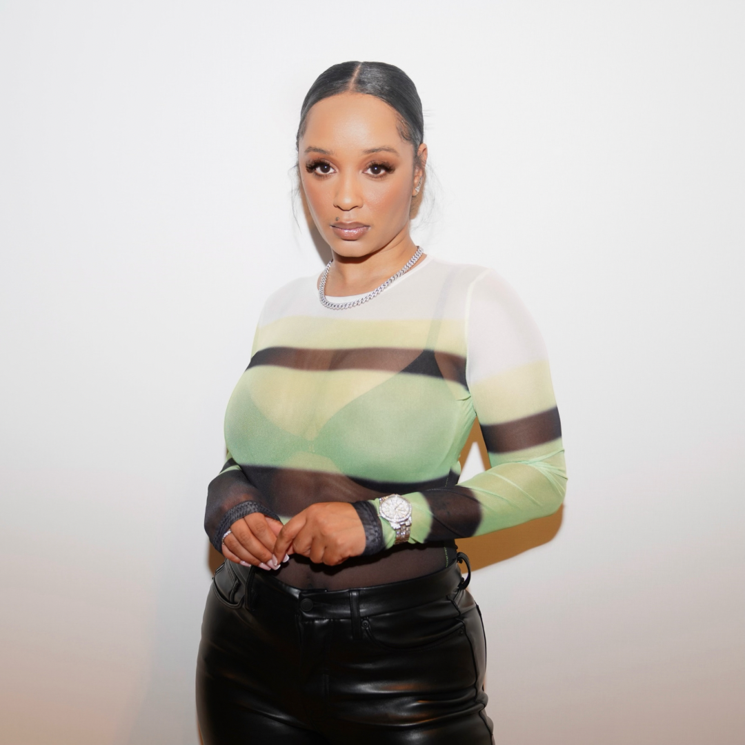 This ensemble features a sleek long-sleeve top made of mesh, featuring an eye-catching green print. The model stands at 5'3" and wears a size Medium.