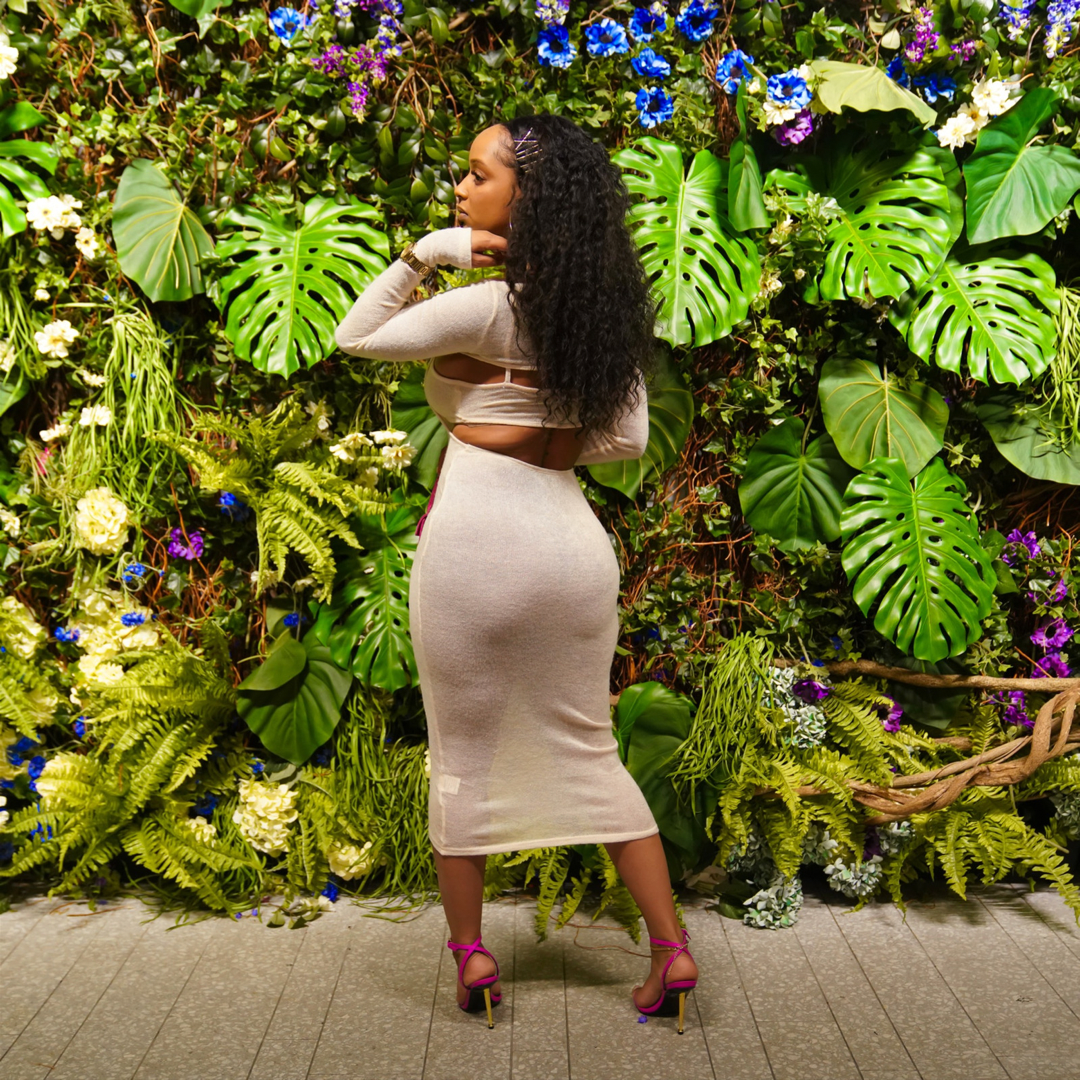 This midi-dress is crafted from a lightweight knit, complete with cut-out sides and a bralette undergarment. The model wears a size Medium and stands at 5ft 3" to provide an idea of fit.