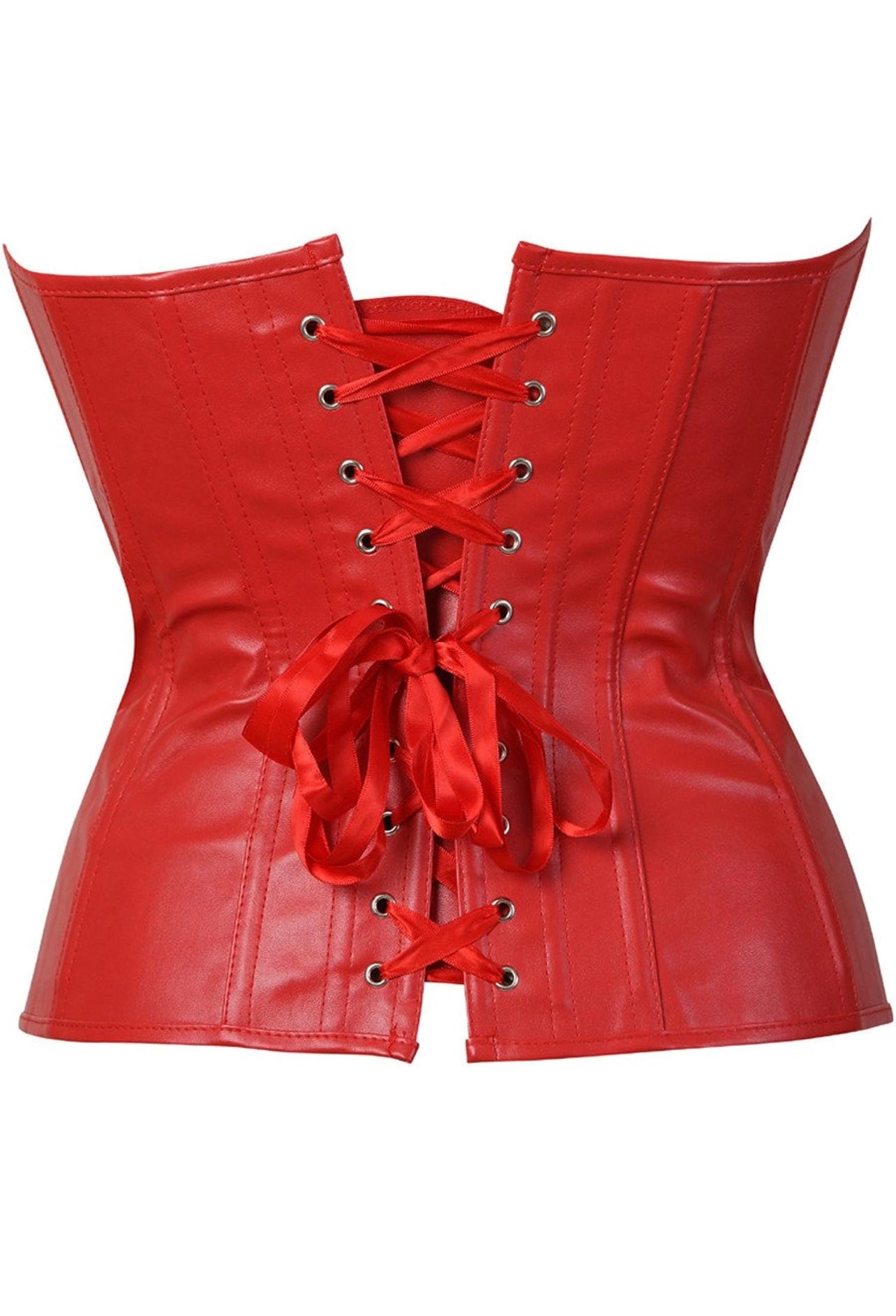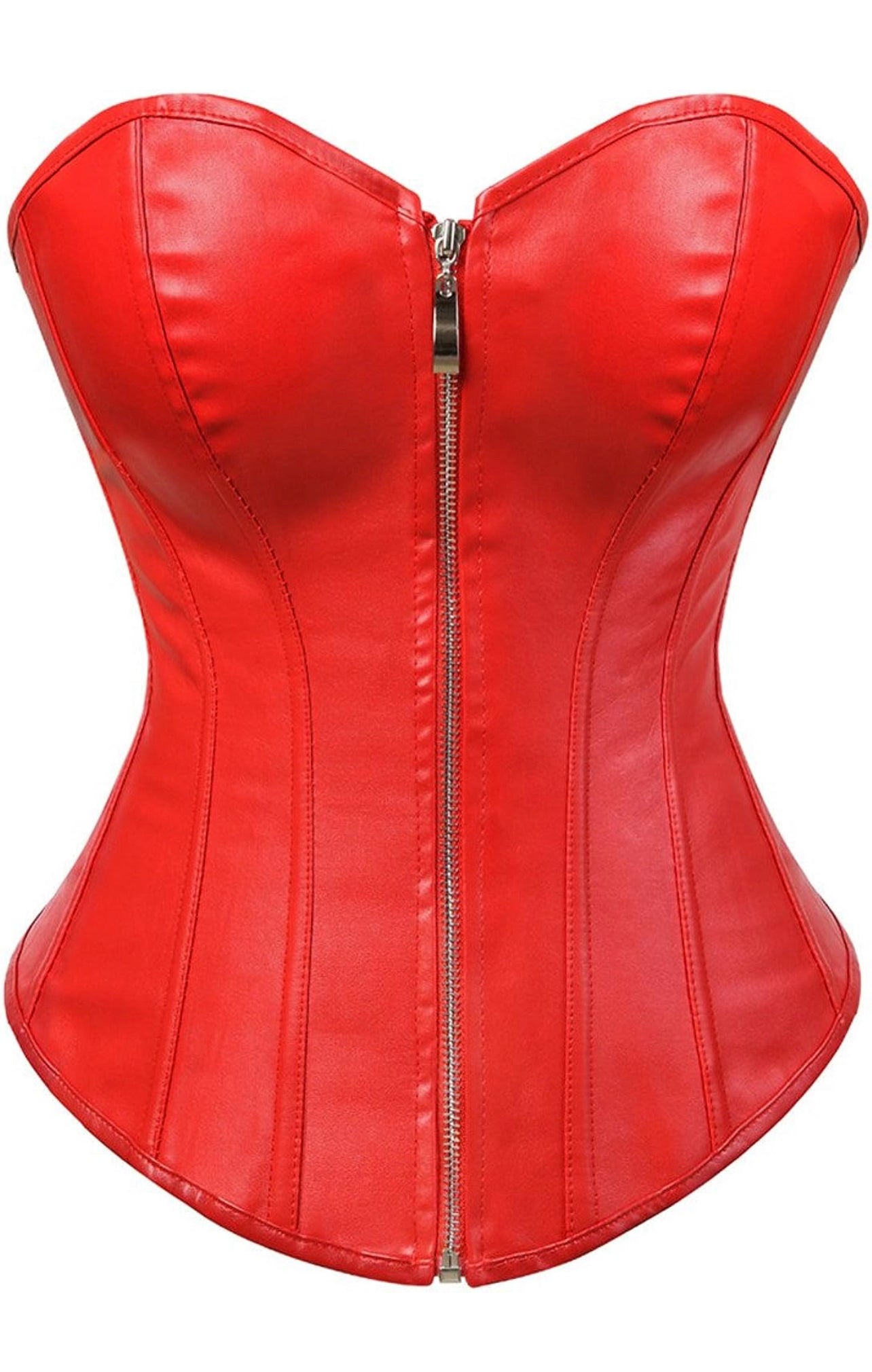 Faux-leather mid-bust corset showcasing a stylish and fashionable look. Secured with a front zipper closure and lace-up back for adjustable fit. The model stands at 5'3" and wore a size Small.